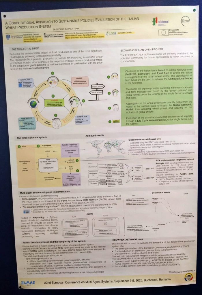 From September 3 to 5, 2025, the EcoWheatItaly project was presented at the 22nd European Conference on Multi-Agent Systems (EUMAS 2025), hosted by the University POLITEHNICA of Bucharest (Romania), one of the most relevant European venues for research on distributed AI and agent-based simulation.