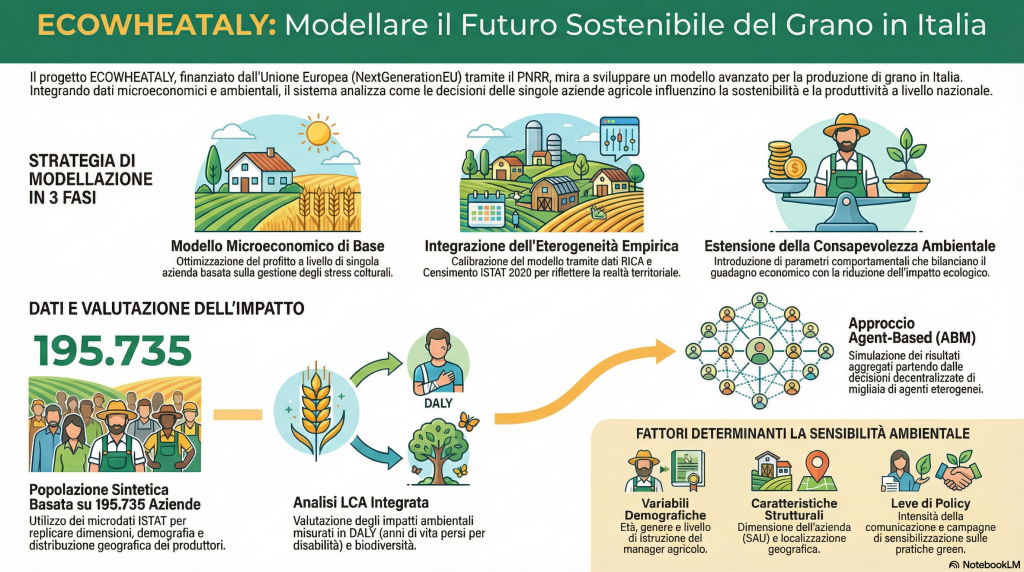A questo proposito, ECOWHEATALY affronta questo tema in un contesto complesso con dinamiche di interazione socio-economica e ambientale; per affrontare la complessità del mondo reale, ECOWHEATALY costruirà un modello basato su agenti per il sistema di produzione del grano in Italia.